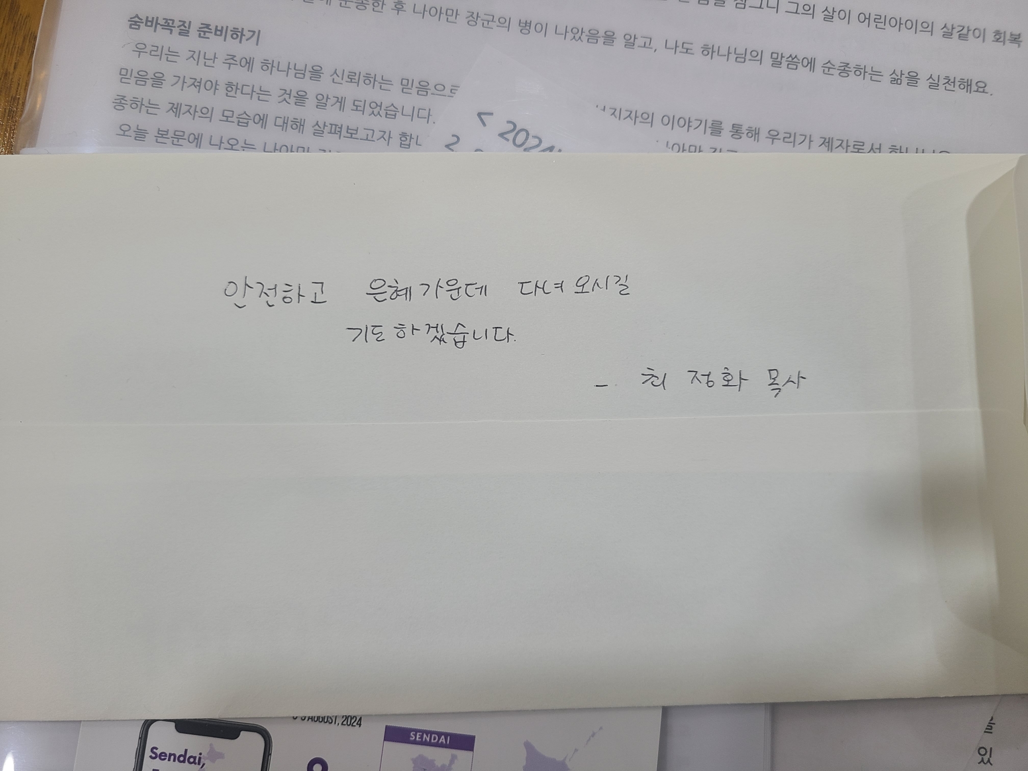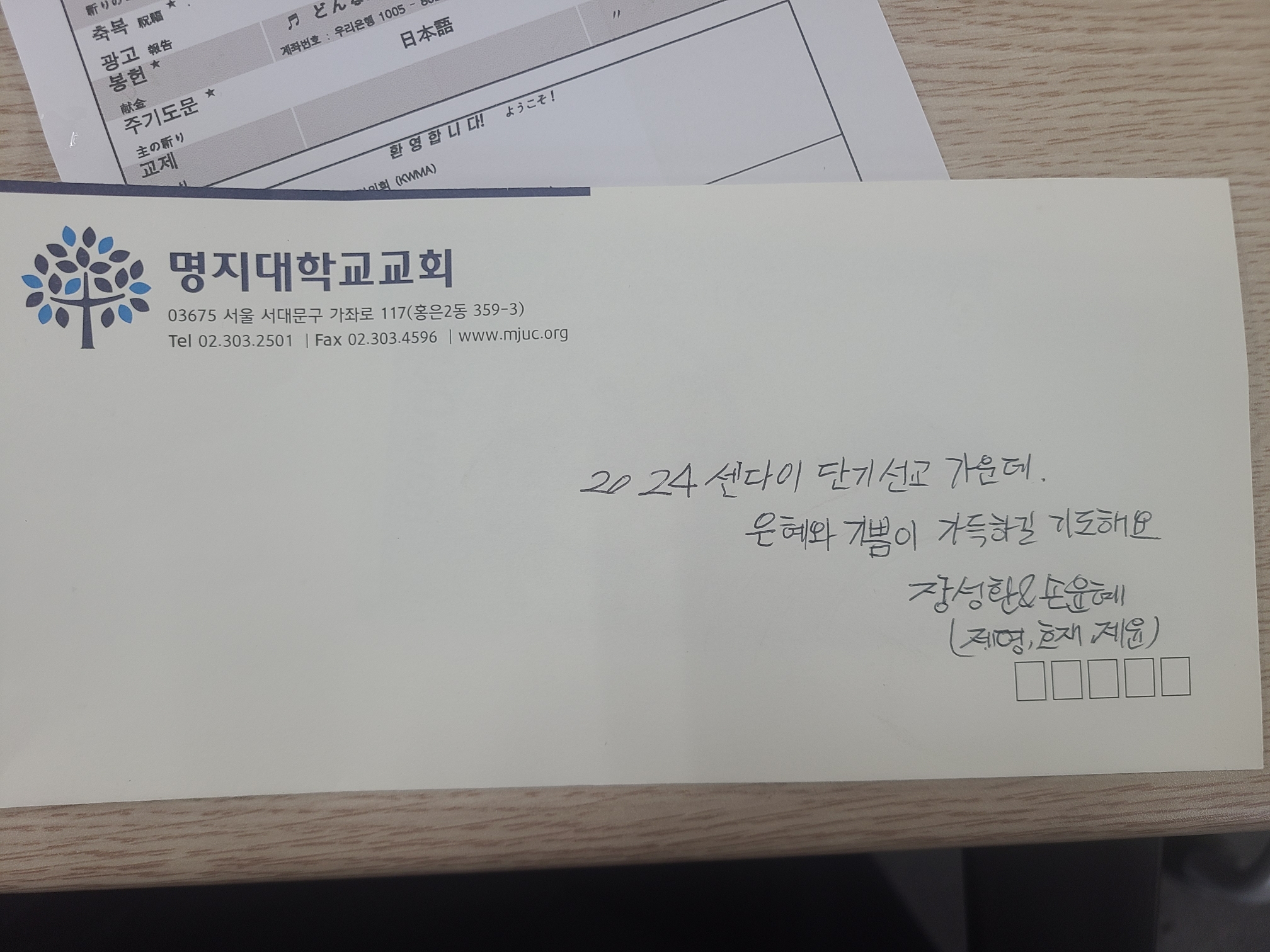 담임목사님께서 일본선교에 대한 이야기를 설교 중에 언급하시고, 교회에서 곧 실시할 GM5(5명 또는 5가정이 하나의 선교지를 후원하고 섬기는 프로젝트)를 독려하며 가장 먼저 일본을 예시로 드시는 등 갑자기 일본이라는 키워드를 말씀하셨습니다. 그래서 청년교구 담당 전도사님을 통해 단기선교 간다는 소식을 들으셨나보다 싶었는데, 선교 출발 1주일 전까지 전혀 모르고 계셨습니다. 놀라웠습니다! 뭔가 하나님께서 마음을 흔들어 주신 것 같았습니다.
