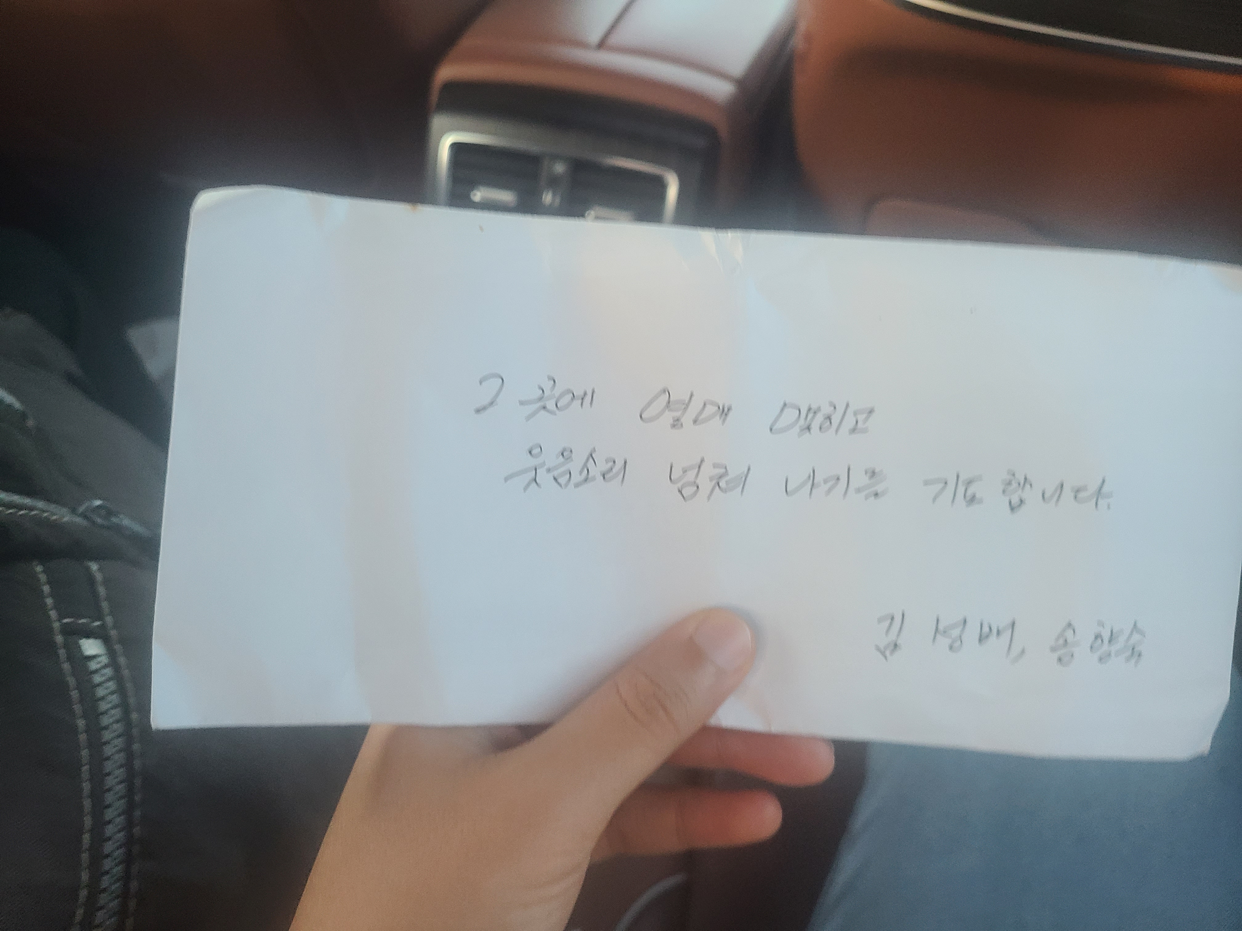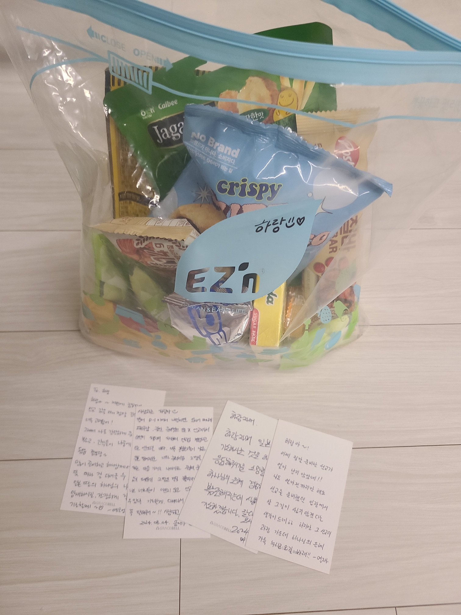 저녁예배를 마치고 나오자 청년교구에서 저희를 위해 간식과 편지를 준비한 것을 전달받고 마음이 몽글해졌습니다. 저는 올해 초 일본을 다녀온 후 청년교구와 일이 조금 있었기 때문에(ㅜㅜ) 더 감동적이었습니다.